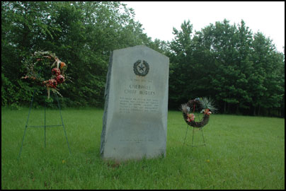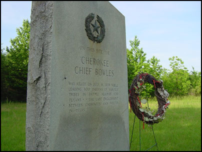 This stone marks the location of the Battle of Neches (1839) in which hundreds of Texas troops attacked a Delaware village which housed Indians from many tribes (including the Cherokee). Over 100 Indians were killed, among them Duwali, and the village was burned.